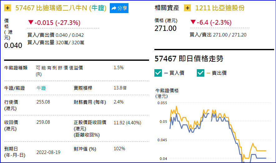 周三恒生指数收23420.76点,午后跌幅有所扩大,利空消息冲击生物科技板块,引发避险情绪。近期大市气氛偏波动,恒指反复震荡寻底,美联储议息会议落幕,隔夜美股先跌后升,整体反映偏正面。看反弹部署,可留意恒指牛证51190,收回价22810点,杠杆比率约30.22倍;继续看空,可留意恒指熊证58467,收回价24040点,杠杆比率约28.39倍。