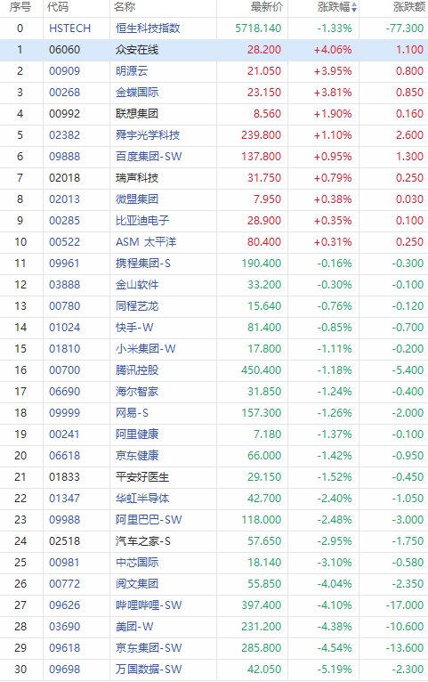 成分股中,众安在线涨超4%,SaaS概念股,明源云、金蝶国际涨超3%,联想集团涨近2%;万国数据跌超5%,京东、哔哩哔哩、美团跌超4%,中芯国际跌超3%,阿里巴巴跌超2%。其中万国数据、哔哩哔哩股价刷新上市新低。