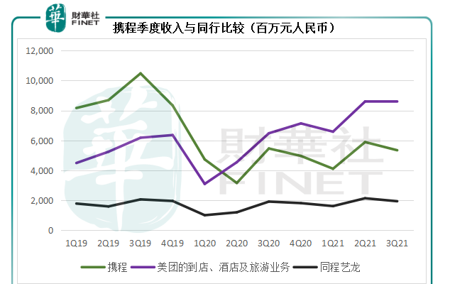 2021年第3季,携程的酒店预订及运输票务业务收入同比下降11.50%及4.57%,至21.94亿元(单位人民币,下同)和18.17亿元,抵消了度假产品、商旅及其他业务整体收入增幅23.50%,拖累该公司的季度收入净额按年下降2.16%,至53.44亿元。