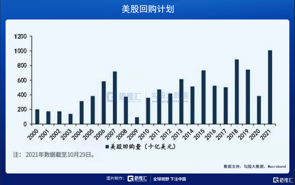 另一个是海量的美股回购。2008年金融危机之后的新一轮超强QE以来,美股就开始持续出现上市公司海量的股票回购潮,据粗略估计,到现在总数额超过了5万亿美元。仅在今年来,美国企业已批准了逾8700亿美元的股票回购,是2020年同期的3倍。标普500指数成分股公司三季度真实回购总额为2345亿美元,超过了2018年第四季度创下的2230亿美元回购纪录。