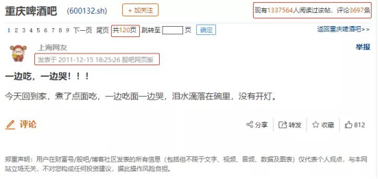 “关灯吃面”最早来源于2011年12月15日股吧“重庆啤酒吧”上的一篇题为《一边吃,一边哭!!!》的帖子。楼主发的内容很简单,如图所示: