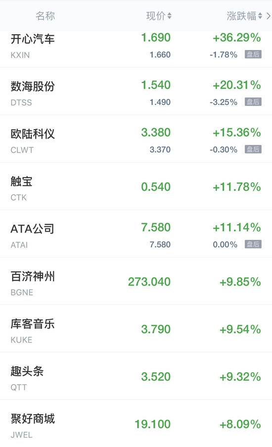 领涨中概股列表: