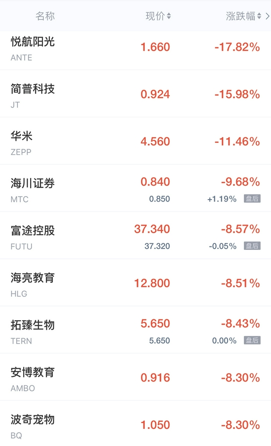 领跌中概股列表: