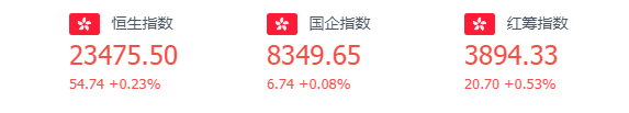 周四港股三大股指日内同创年内新低后集体收涨,恒生指数涨0.23%或54.74点,报23475.50点。国企指数涨0.08%,报8349.65点;恒生科技指数涨0.46%,报5822.14点。