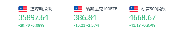 道指周四收盘下跌29.79点,跌幅为0.08%,报35897.64点;纳指跌385.15点,跌幅为2.47%,报15180.43点;标普500指数跌41.18点,跌幅为0.87%,报4668.67点。