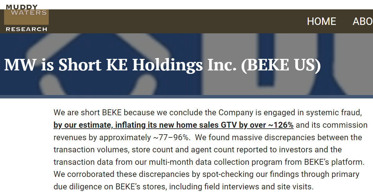 12月16日,浑水发布针对贝壳的沽空报告。报告称,我们之所以卖空贝壳,是因为我们得出结论,该公司涉嫌系统性欺诈,据我们估计,将其新房销售总交易额夸大了约126%以上,并将其佣金收入增加了约77-96%。