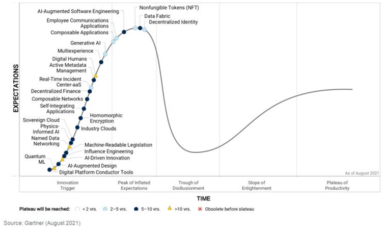 2021年8月24日,老牌信息技术研究和分析公司 Gartner 发布的“2021年新兴技术成熟度曲线”(Hype Cycle for Emerging Technologies,2021),我们可以非常清晰地看到经常讨论的 Web3 技术,包括去中心化金融、NFT等等,被判定在什么阶段。