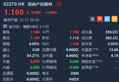 华盛资讯12月17日讯,物管服务企业德商产投服务 $02270.HK 首挂高开4.50%,一手账面浮盈100港元, 盘前成交额392港元,最新总市值近6.96亿港元,昨日暗盘收涨7.21%。