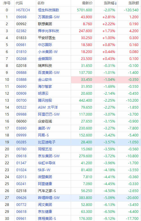携程跳水跌超9%,哔哩哔哩跌超5%,续刷盘中历史新低;京东健康、阅文集团跌超6%,快手跌超4%,美团跌超3%、腾讯控股跌超2%。