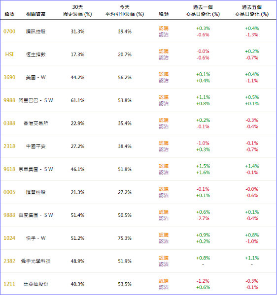 周四恒指相关权证的平均引伸波幅报约20.7%,按日变动不大。个股方面,美团、阿里巴巴、京东集团、快手等相关认购证和认沽证的引伸波幅均按日调升;腾讯控股、港交所、百度集团等相关认沽证的引伸波幅按日下降。