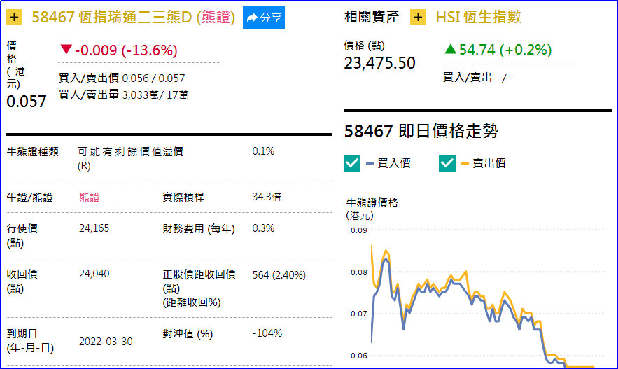 2、看错方向:恒指瑞通二三熊(58467.HK),周四下跌13.64%。