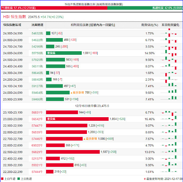 街货分布方面,至周四,恒指牛证街货主要在收回价22500点至23200点之间,累计相当约8460张期指合约;恒指熊证街货在收回价23900点至24700点之间,累计相当约4177张期指合约。