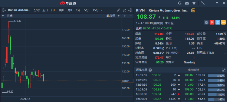 华盛资讯12月17日消息,今日美股盘前,Rivian $RIVN 跌超10%,上市后首份财报不及预期,Q3营收100万美元,预计今年汽车产量较目标“少几百辆”。