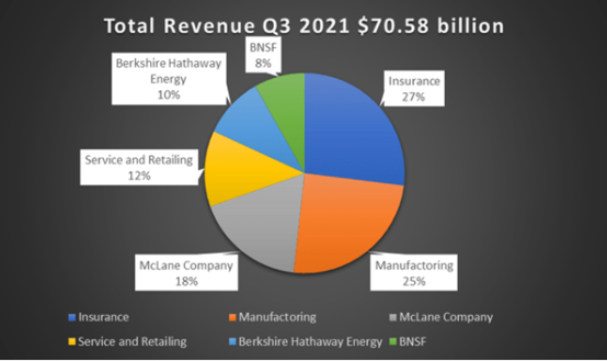 以伯克希尔B为例,具体来看一下该公司的基本面情况。在年度报告中将运营公司分成4部分,在财务申报文件中将运营公司分成6个部分。该公司在保险业务方面有11家运营公司,铁路、公用事业和能源业务有12家运营公司,制造业有23家运营公司,服务和零售业务下面有23家运营公司。在2021年第三季度,每个业务部门产生的收入如下: