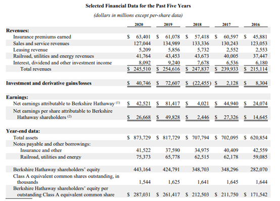 伯克希尔是美国收入和净利润最大的公司之一。2020年,伯克希尔在美国《财富》500强中排名第六,全球《财富》500强排名第十四。年报显示,伯克希尔2020年营收为2455.1亿美元,净利润为425.21亿美元,总资产达到8737.29亿美元。