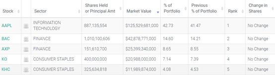 苹果公司仍为伯克希尔的头号重仓股,维持8.871亿股股票持仓不变,持股市值1255亿美元,在披露的持仓资产中占比为43%;与上一季度相比,伯克希尔前十大重仓股保持相对不变,前五大重仓股仍为苹果公司、美国银行、美国运通、可口可乐、以及卡夫亨氏。