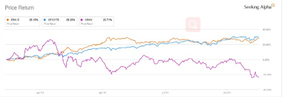 2020年,木头姐凯西伍德所管理的主动型ETF基金ARKK涨幅超过150%,一度被封为女版巴菲特。然而今年以来,科技女神木头姐突然跌下神坛。虽然美股大盘仍在节节攀升,各大科技股也屡创新高,但ARKK的表现却并不尽如人意。不过,巴菲特却在今年一个专注于成长股的市场中成功寻找到价值股的投资机会。
