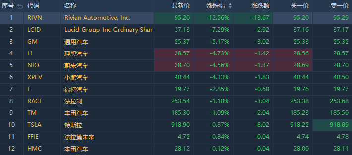 截至发稿,Rivian $RIVN 跌超12%,Lucid $LCID 跌超7%,通用汽车 $GM 跌超5%,理想汽车 $LI 、蔚来汽车 $NIO 、小鹏汽车 $XPEV 跌超3%,福特汽车 $F 跌超2%,特斯拉 $TSLA 跌0.8%。