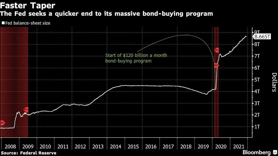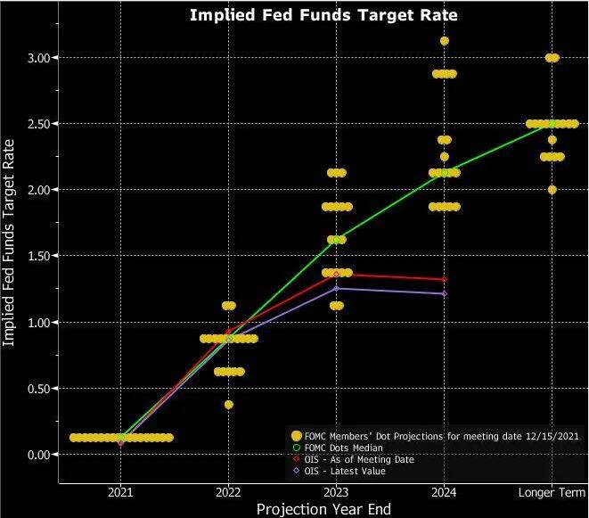 美联储在本周三的利率决议上决定将减码债券购买的步伐提高一倍,从而使资产购买计划有望在3月中旬前结束。他们还暗示,预计基准联邦基金利率明年上调三次可能是合适的。