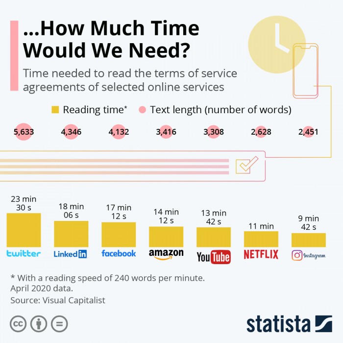 相比之下,排名第 14 位的 Instagram 的用户协议“精简”到只有 2451 字,预计可在 10 分钟内完成阅读。