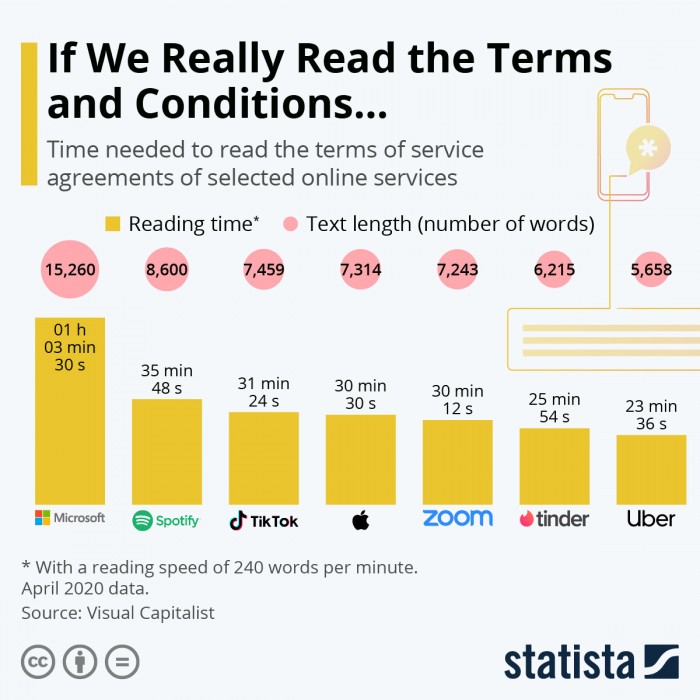 针对各大科技企业的使用条款 / 用户协议,Statista 刚刚在最新分享的信息图表中给出了高低排列。尽管在 18-34 岁的受访者中,高达 97% 的人都会不看直接点确认。但余下的 3% 少数派,显然也不可能都由律师等法律专业人士组成。以使用苹果服务必须创建的 Apple ID 附加声明为例,其字数达到了 7314 个。若每分钟可平均扫过 240 个单词,读完也得耗费 30 分钟。