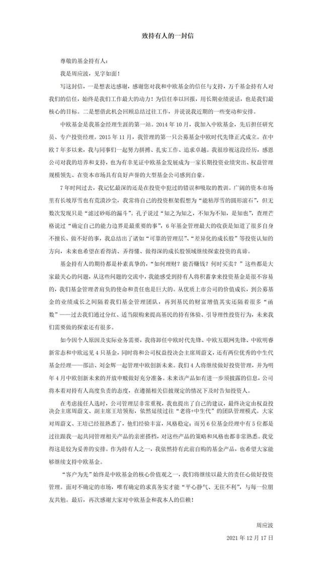 在卸任公告发布同时,中欧基金也发布了周应波《致持有人的信》。信中周应波感慨6年基金管理最大的收获是知道了很多自身不擅长、做不好的事,总结出了诸如“可靠的管理层”、“差异化的成长股”等投资认知的方向,未来也希望在看得清、弄得懂、做得深的成长股领域继续探索投资的真谛。