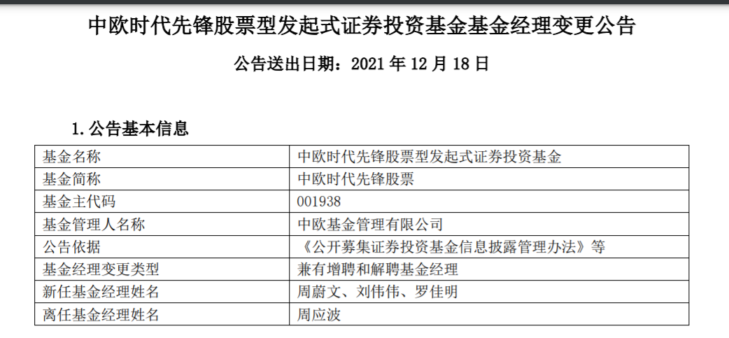 12月17日晚,中欧基金发布公告称,基金经理周应波因个人原因卸任中欧时代先锋、中欧互联网先锋、中欧明睿新常态和中欧远见4只基金。