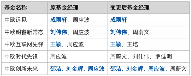 周应波的卸任后,中欧时代先锋、中欧互联网先锋、中欧明睿新常态和中欧远见4只基金将由中欧基金投决会主席周蔚文、副主席王培率领绩优中生代基金经理管理。同时,中欧创新未来增聘周蔚文为基金经理,和周应波、邵洁、刘金辉组成管理小组,负责该产品的投资管理,并为明年4月开放申赎做好准备。
