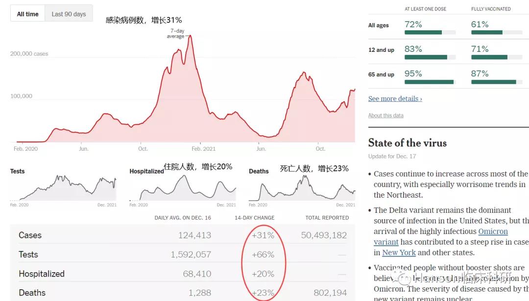 美国最近两周新增病例数、住院人数和病死人数增长都超过20%,疫情状况堪忧。
