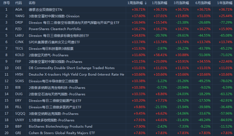 本周累计涨幅居前的美股ETF为3倍做空富时中国50指数 $YANG 、每日二倍做空标普原油与天然气 $DRIP 和每日三倍做多标普生物科技 $LABU 。(AGA、PZD、CJNK、DEE等已退市)