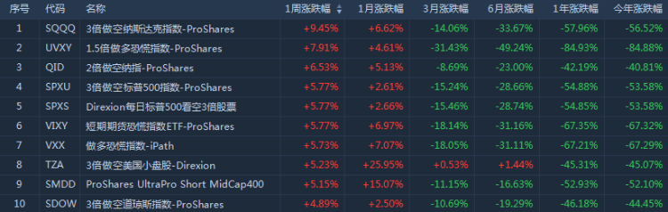 美股指数ETF方面,3倍做空纳斯达克指数 $SQQQ 周涨幅达9.45%,位居榜首;1.5倍做多恐慌指数 $UVXY 的周涨幅为7.91%,2倍做空纳指则为6.53% $QID 。