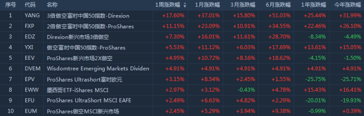 区域ETF涨幅榜上,除了上文提到的做空富时中国50指数的ETF之外,新兴市场3倍做空 $EDZ 也比较靠前,涨幅为7.3%。