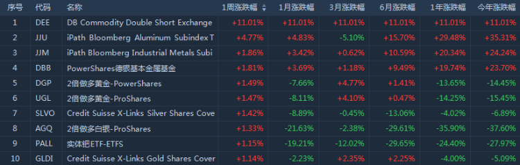 本周金属相关的ETF表现波动较小,涨幅最大的是铝相关的iPath Bloomberg Aluminum Subindex Total Return ETN $JJU ,此外表现靠前的还有德银基本金属基金 $DBB 、2倍做多黄金 $DGP ,涨幅分别为1.81%、1.49%。