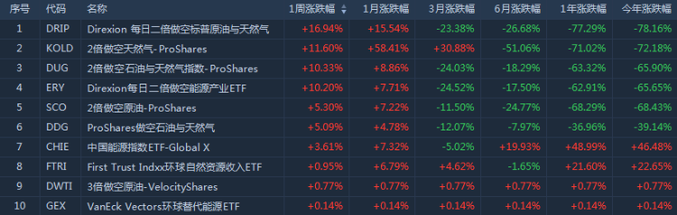能源方面,除上文提及的每日二倍做空标普原油与天然气 $DRIP 外,2倍做空天然气 $KOLD 、每日二倍做空能源产业 $ERY 表现也比较靠前,涨幅分别为11.6%、10.2%。其中2倍做空天然气 $KOLD 本月涨幅已达58%。