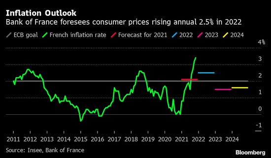 根据法国央行的最新预测,随着能源价格飙升的影响明年减弱,2023年和2024年的CPI涨幅将稳定在1.5%左右。扣除能源和食品,这个欧元区第二大经济体那两年的核心通胀率将为1.7%,而疫情爆发前的7年在0.7%左右。