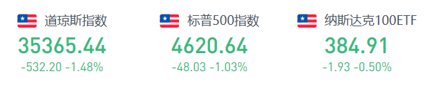 美股上周五道指跌532.20点,跌幅为1.48%,报35365.44点;纳指跌10.75点,跌幅为0.07%,报15169.68点;标普500指数跌48.03点,跌幅为1.03%,报4620.64点。