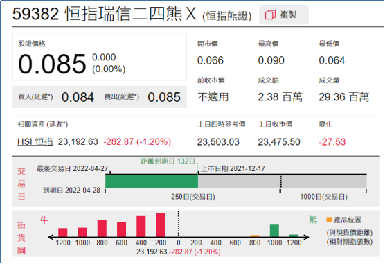 1、强势轮证:恒指瑞信二四熊(59382.HK),上周五大涨28.79%;