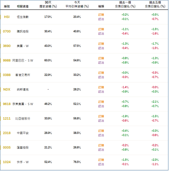 上周五恒指相关权证的平均引伸波幅报约20.4%,按日微幅下降。个股方面,腾讯、美团、比迪相关认购证的引伸波幅均上调超1%。