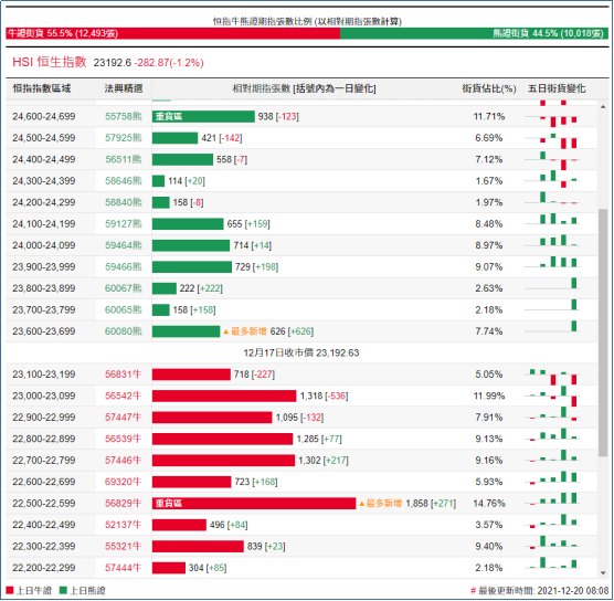 街货分布方面,至上周五,恒指牛证街货主要在收回价22700点至23200点之间,累计相当约5718张期指合约;恒指熊证街货在收回价23600点至24100点之间,累计相当约2449张期指合约。