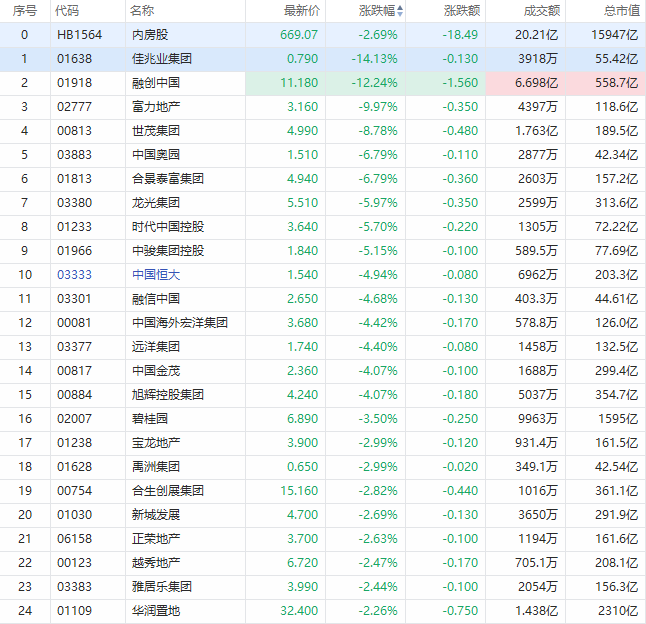 华盛资讯12月20日消息,港股内房股午后走低。截至发稿,佳兆业集团跌14.13%;融创中国跌12.24%,报11.18港元每股,成交额6.69亿港元;富力地产跌9.97%;世茂集团跌8.78%;中国奥园、合景泰富跌逾6%;中国恒大跌4.94%;碧桂园跌3.5%。