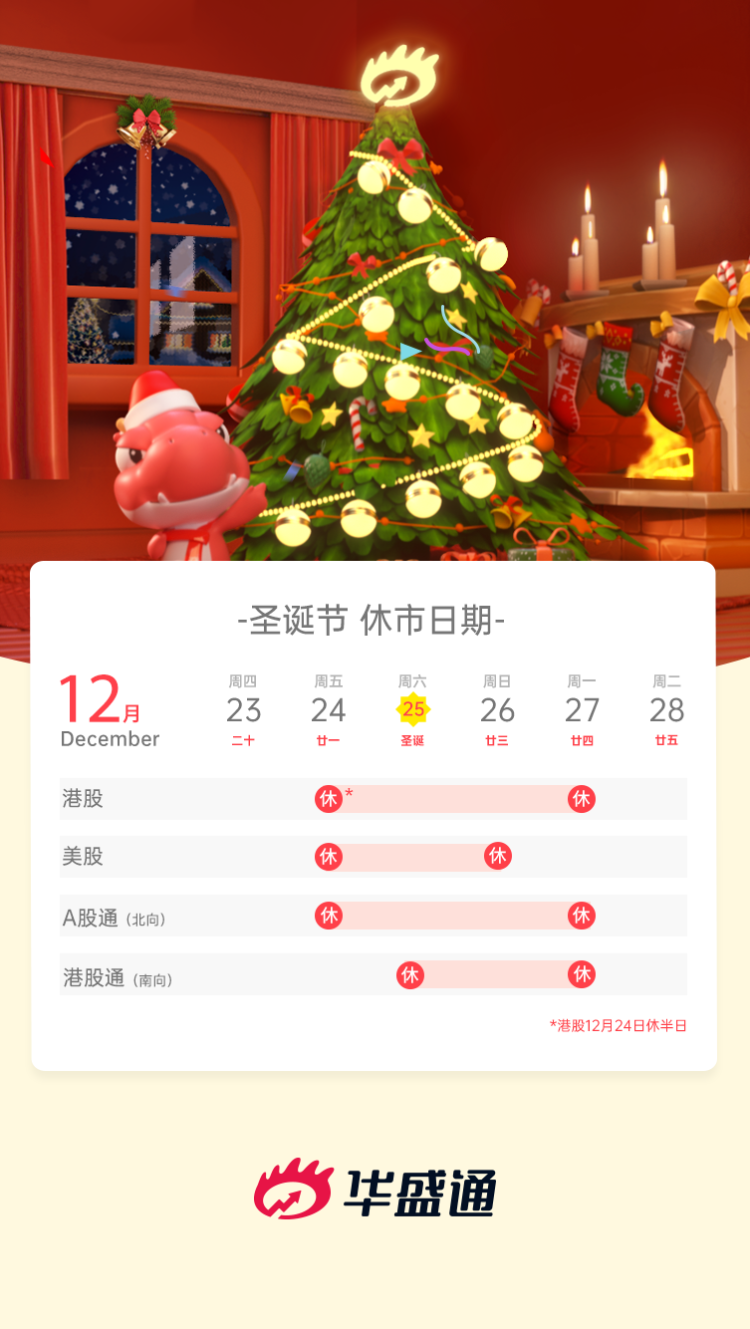 华盛资讯12月20日消息,圣诞即将来临,港股12月24日(星期五)休市半天,12月27日(星期一)休市一天,美股12月24日(星期五)休市一天。具体如下: