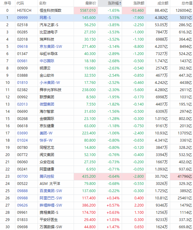 网易跌5.15%,报145.6港元每股;京东集团跌3.14%;小米跌2.52%;腾讯、美团、快手跟跌。部分Saas概念股走弱,明源云跌2.63%;金山软件跌2.54%;比亚迪电子跌3.53%;中芯国际跌2.68%。
