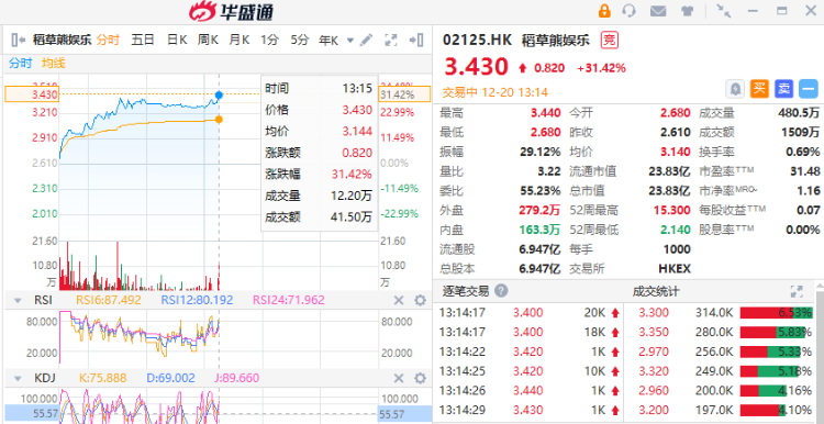 华盛资讯12月20日消息,稻草熊娱乐(02125)持续走高。截至发稿,稻草熊娱乐涨31.42%,报3.43港元,成交额1509万港元。
