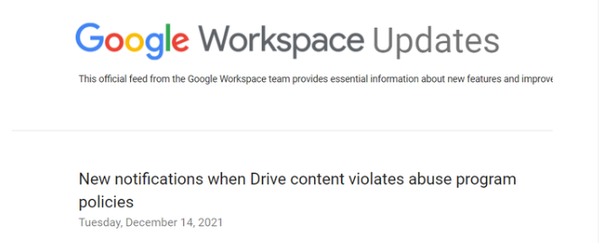 近日,谷歌宣布了其专有云存储 Google Drive 的新使用条款,根据该条款,谷歌将开始限制违规文件的访问。该审查从 2021年12月14日开始逐步推出,适用于所有 Google Workspace 用户以及 G Suite Basic 和 Business 用户。