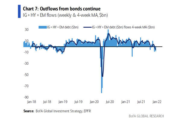 根据美国银行的Michael Hartnett编制的最新EPFR数据,上周也出现了自2020年7月以来规模最大的被视为“安全区”的美国国债的资金流入,达到36亿美元;同时,IG债券也出现了自今年3月以来的最大规模资金流出,达到64亿美元;HY&EM债券出现了自去年4月以来的最大规模的资金流出,达到29亿美元。
