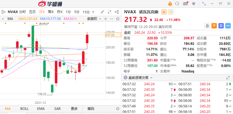 截至北京时间19:57,诺瓦瓦克斯盘前上涨逾10%。消息面上,据欧盟消息人士透露,诺瓦瓦克斯医药预计将于2022年第一季度开始向欧盟交付新冠疫苗。此外,世界卫生组织(WHO)将Nuvaxovid列入紧急使用清单,允许用于对18岁及以上的个人进行主动免疫。