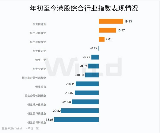 从港股市场综合行业指数表现来看,今年以来港股市场中仅恒生能源业、恒生公用事业、恒生原材料业三大行业指数上涨,其中恒生能源业表现最佳,年初至今涨幅达19.13%。恒生资讯科技业、恒生医疗保健业、恒生地产建筑业、恒生必需性消费业、恒生综指、恒生非必需品性消费业指数今年以来跌幅均超过10%,其中恒生资讯科技业指数跌幅达35.05%居首。