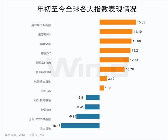 据Wind数据统计,从全球各大指数表现来看,道琼斯工业指数涨幅达15.55%居首,俄罗斯RTS、MSCI全球、德国DAX、英国富时100、澳洲标普200上涨幅度均超10%。而恒生指数表现领跌全球,今年以来下跌幅度达16.47%。