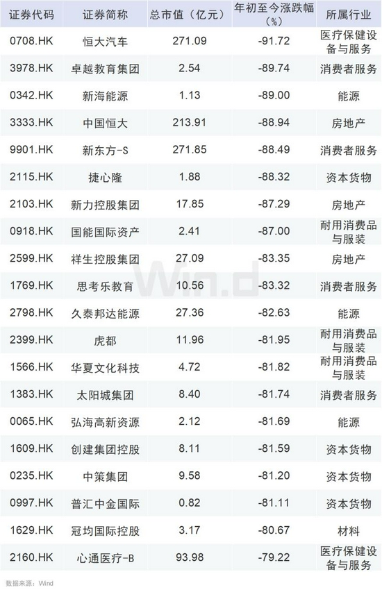 据Wind数据显示,今年以来下跌超50%的港股共有193只,占比达到8.67%,在跌幅榜前列出现最多的基本为教育、地产、消费类个股,不少核心资产股价遭遇“脚踝斩”。