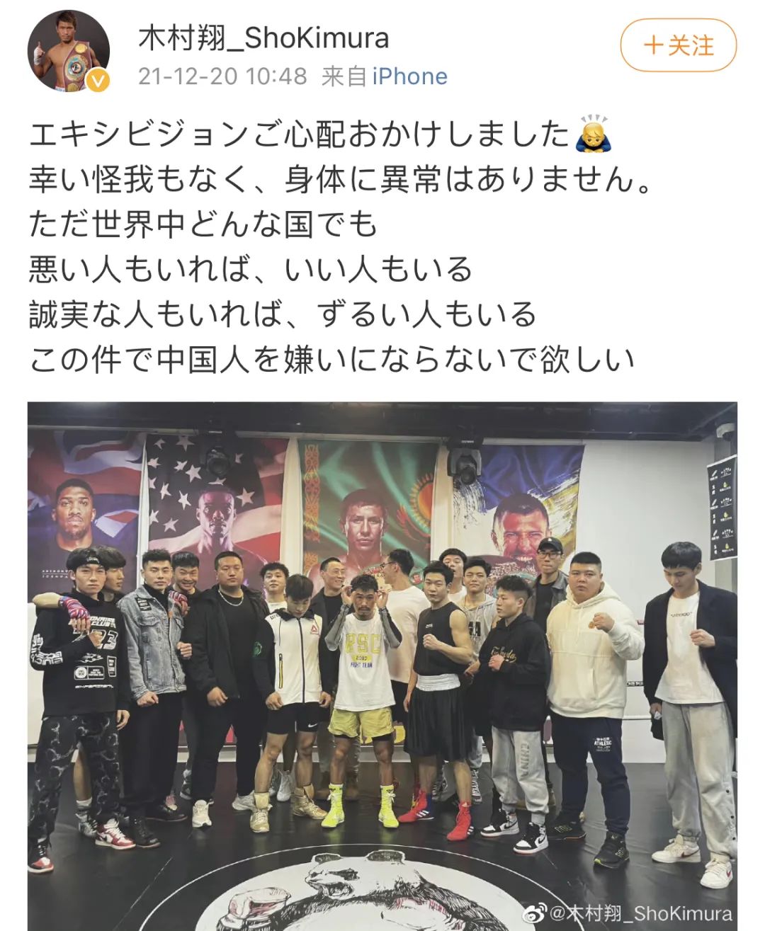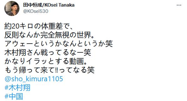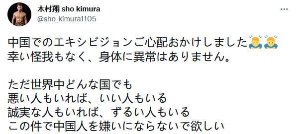 赛后,玄武还将KO视频发到网上,留言称“中国打日本还需要规则吗?他不死我睡不着觉啊!”,并称批评他的网友是“汉奸”。而今天(20日)在微博和Twitter同步向粉丝报平安的木村翔却表示,“世界上任何一个国家,都有坏人、好人、真诚的人和狡猾的人,希望大家不要因为这件事讨厌中国人。”